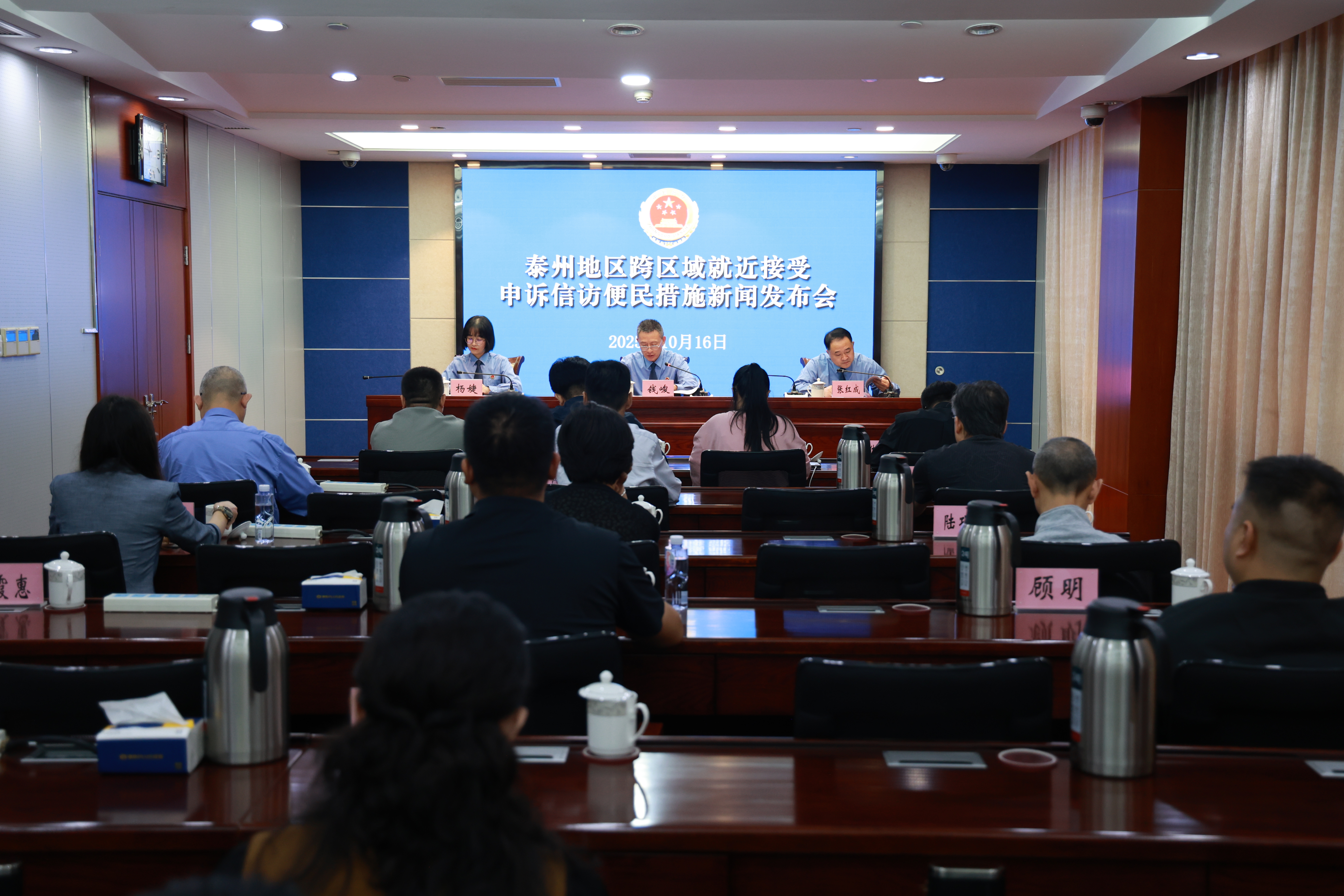 10月16日,泰州市检察院举行泰州地区跨区域就近接受申诉信访便民措施新闻发布会。江苏法治报、泰州电视台等多家媒体、人大代表、政协委员以及社会群众代表参加了发布会。